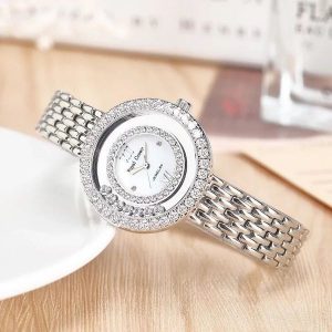 - Đá đính trên vỏ và dây đồng hồ là đá CZ- Zirconia với độ cứng từ 8- 8,5 (Chất lượng rất tốt nếu so với Ruby: 9 và Kim cương: 10).